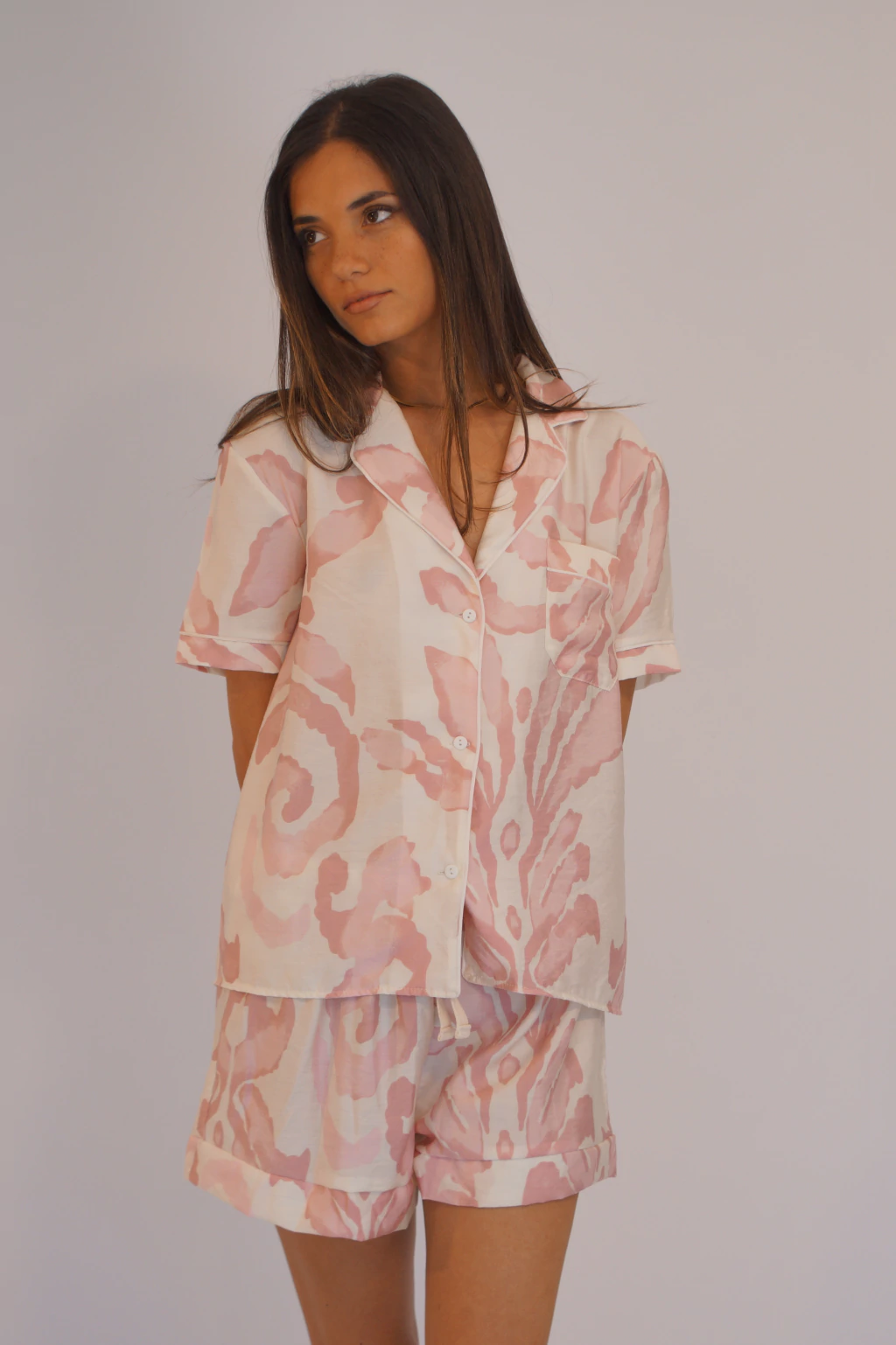 Pijama camisero de sedita arrugada fondo off-white con estampa en tonos rosados, compuesto por CASACA MANGA CORTA con cuello solapa y bolsillo y SHORT tiro medio con elástico en la cintura más lazo.