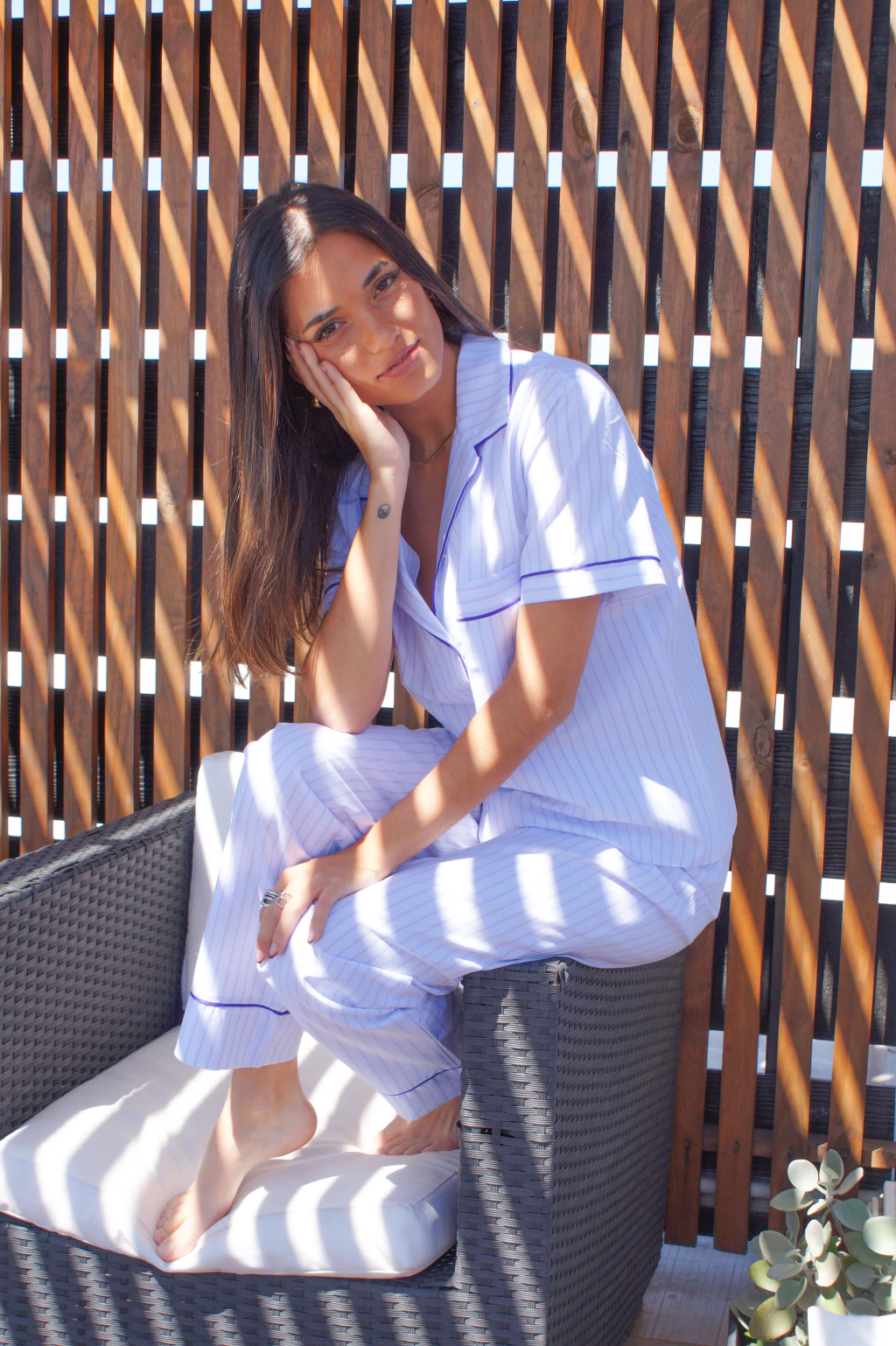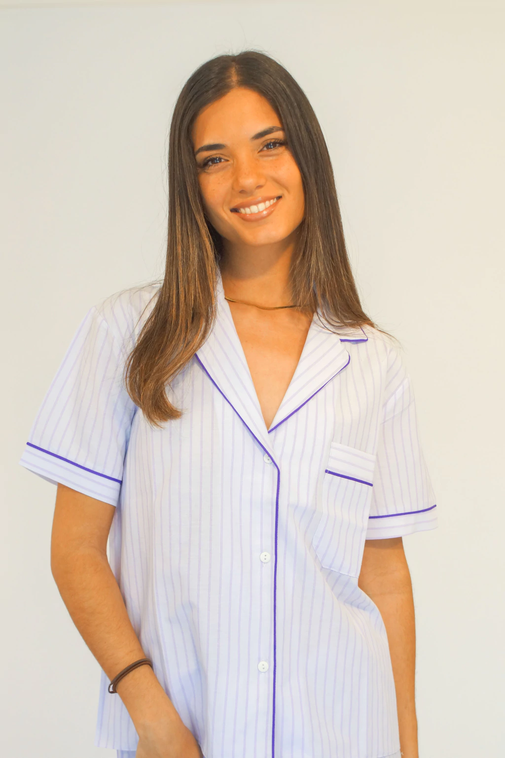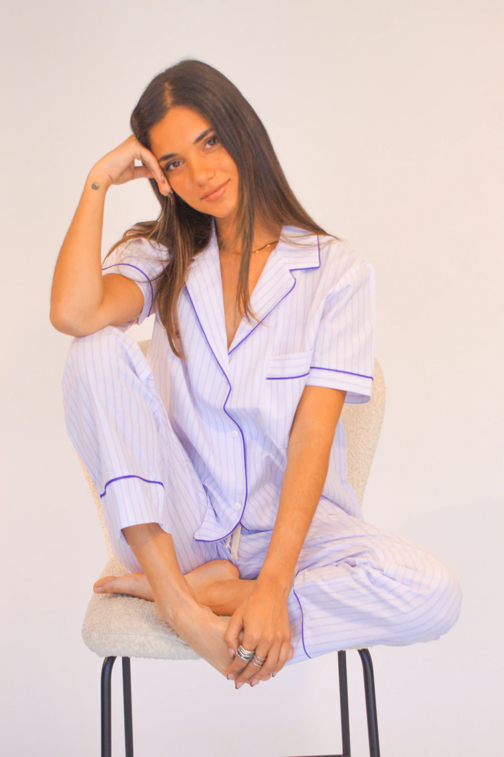 Pijama camisero rayado de poplín de algodón en lila y blanco, compuesto por CASACA MANGA CORTA con cuello solapa y bolsillo y PANTALON LARGO tiro medio con elástico en la cintura más lazo.